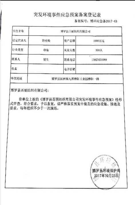 已制訂《博羅縣百麗紡織有限公司突發(fā)環(huán)境事件應(yīng)急預(yù)案》,并于2017年 10月25日在博羅縣環(huán)境保護(hù)局備案,